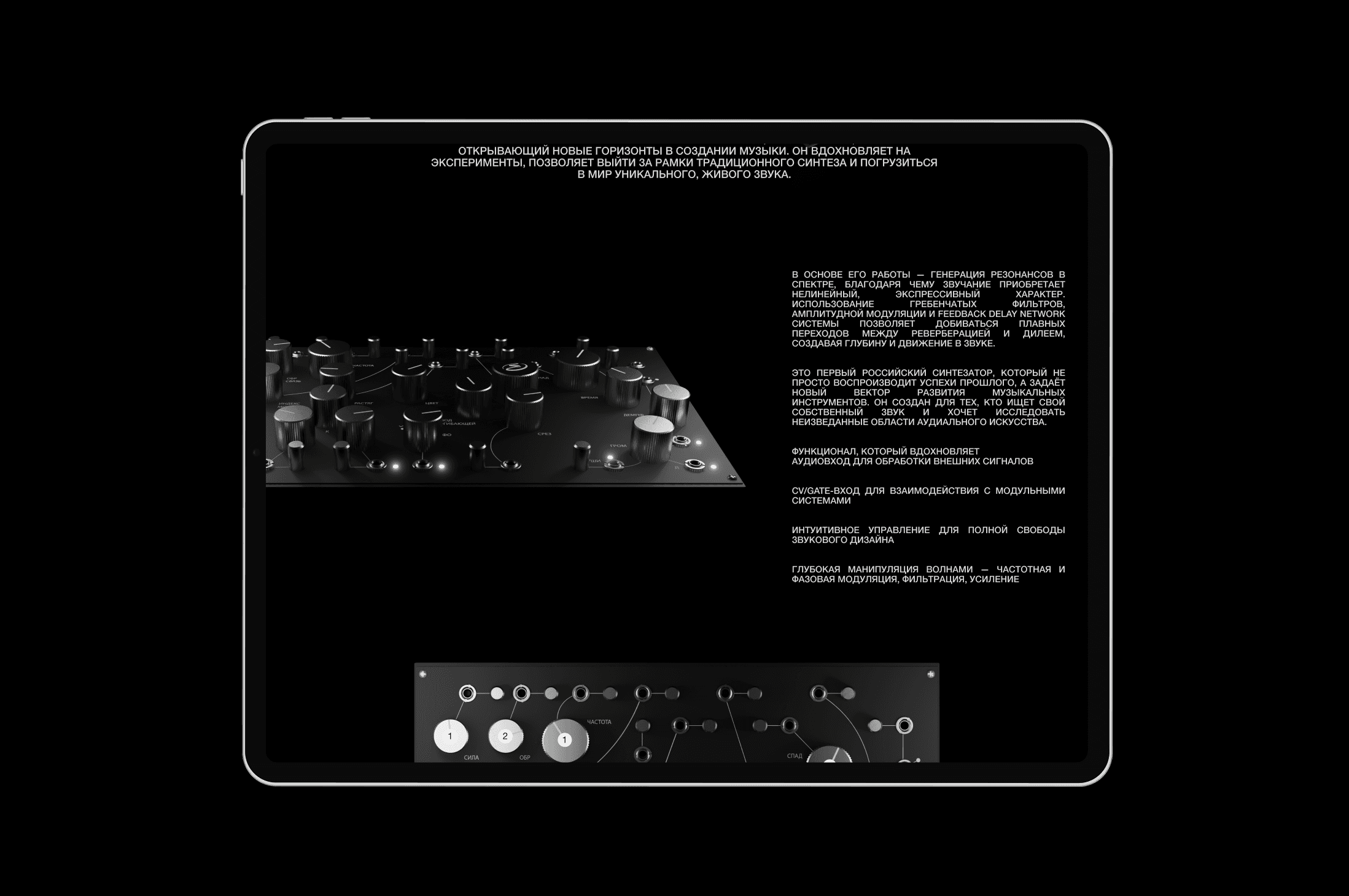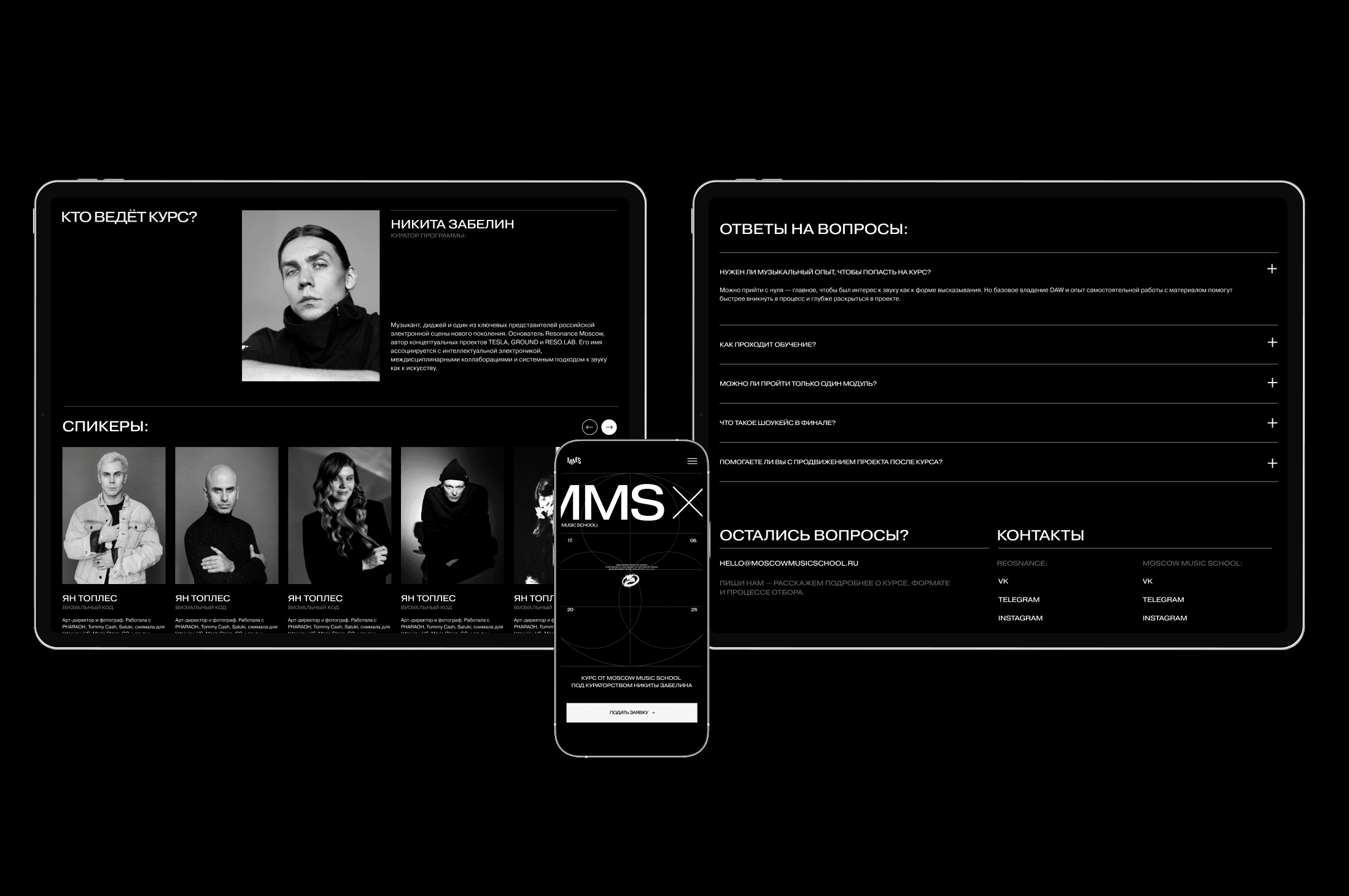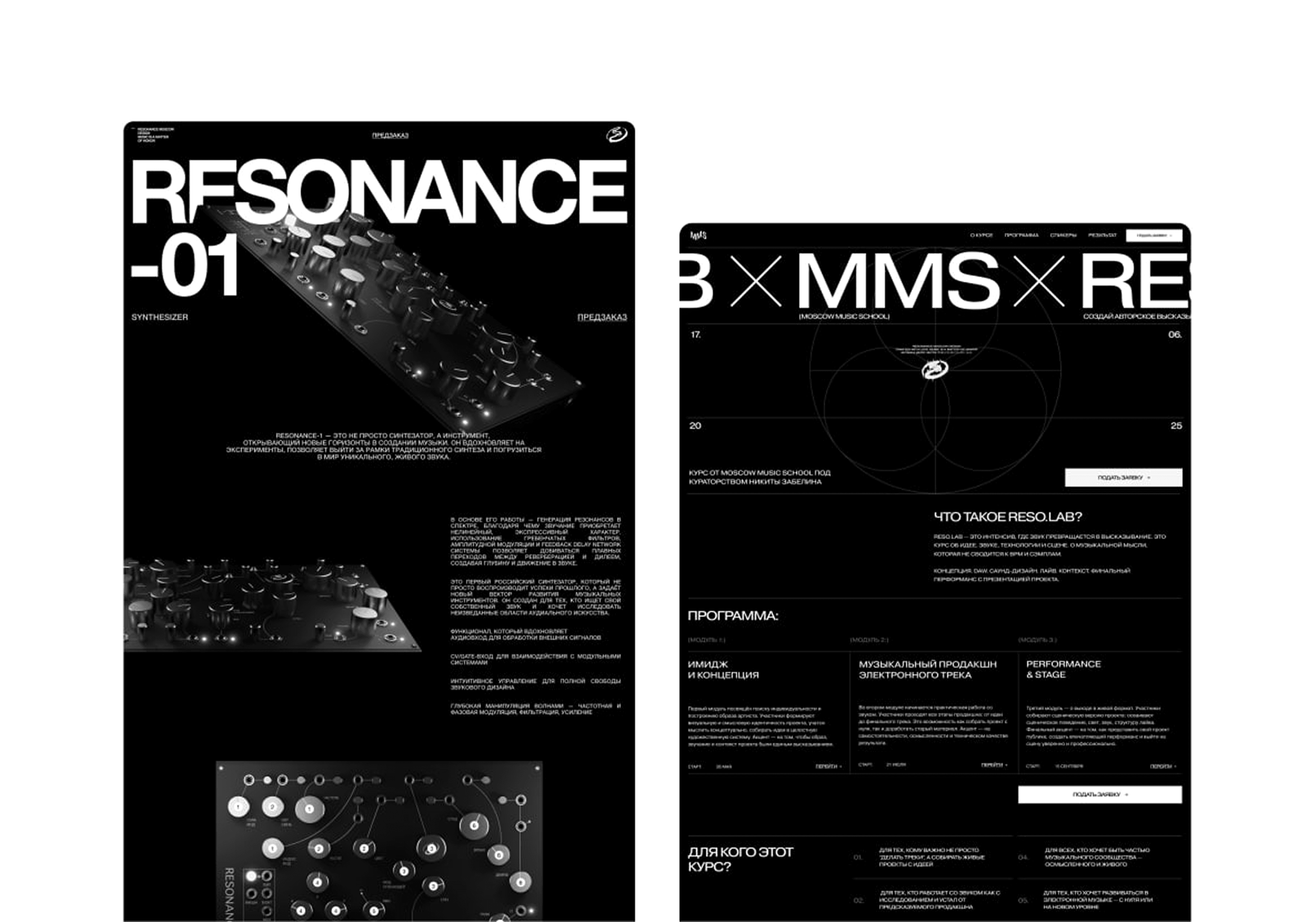 Web design for a music course by a modern Moscow music label, and a promo landing page for a synthesizer