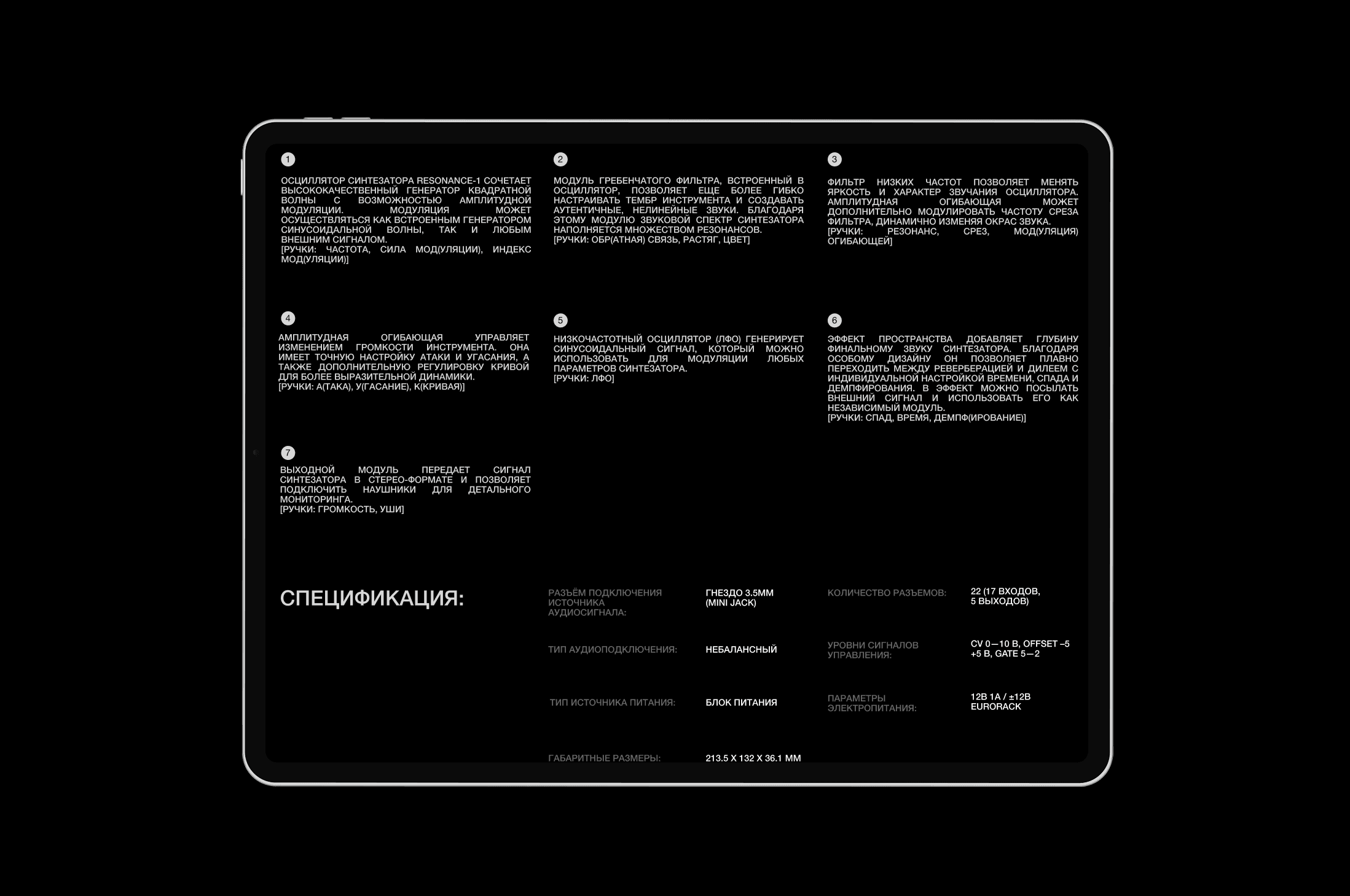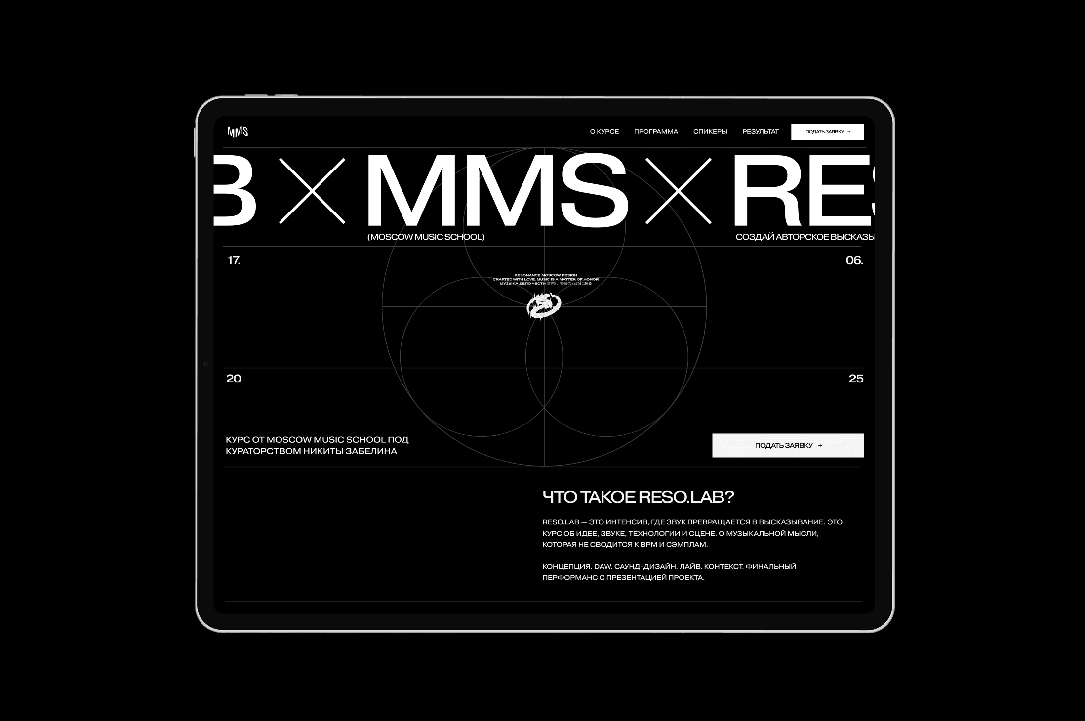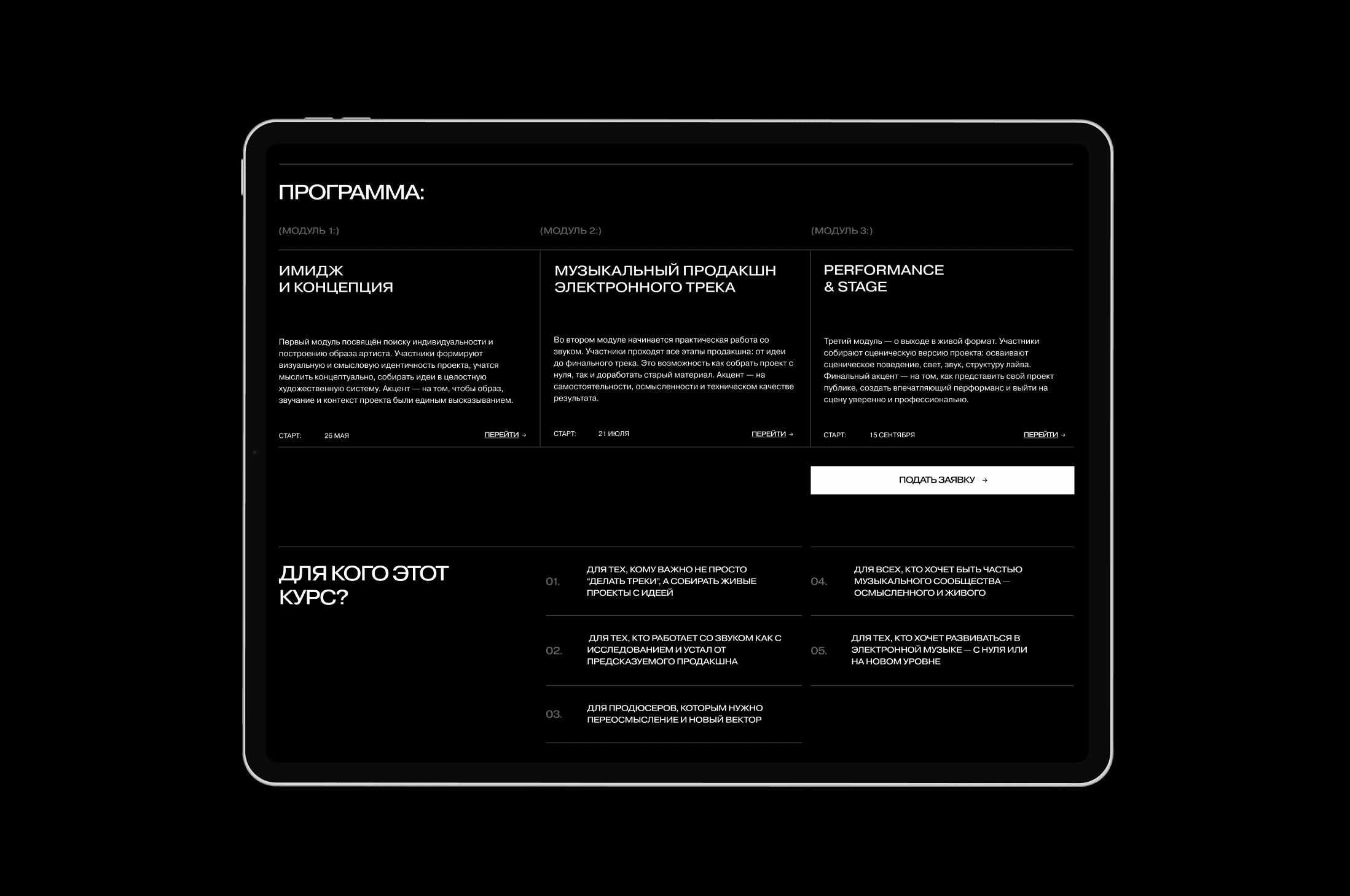 Web design for a music course by a modern Moscow music label, and a promo landing page for a synthesizer